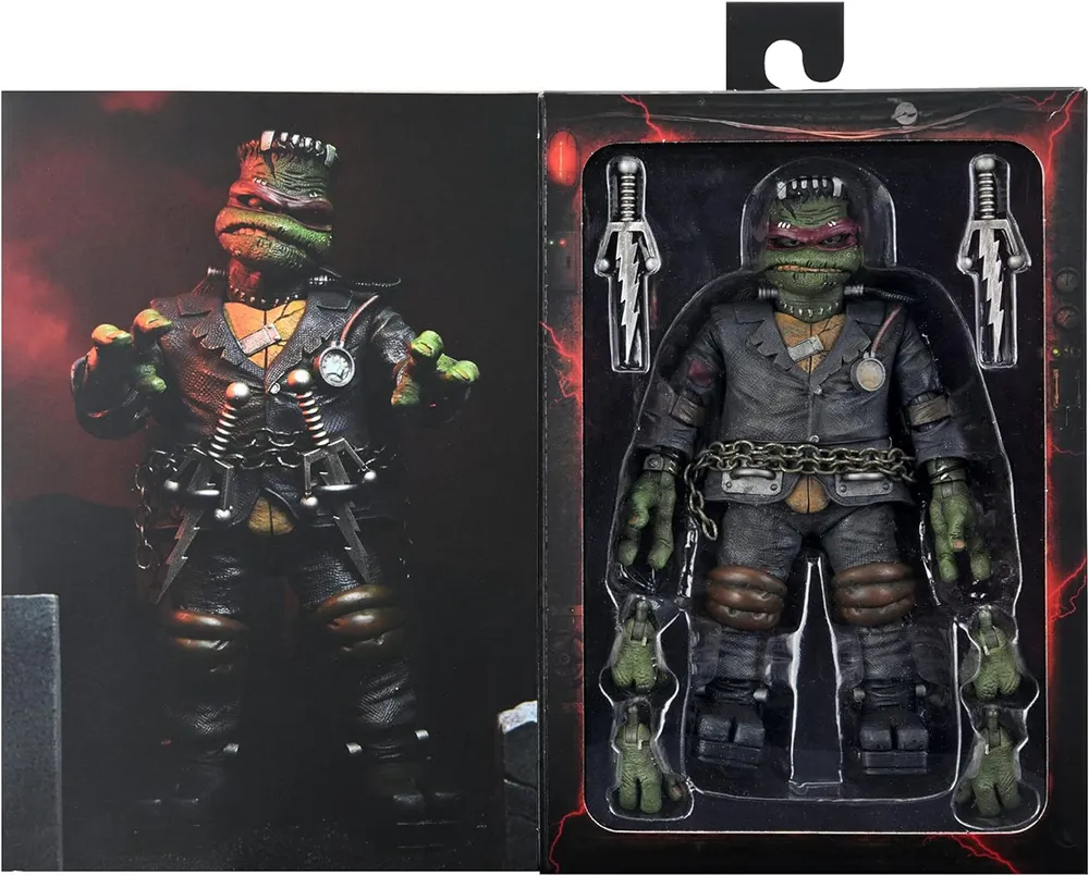 Фигурка подвижная, принимает разные позы. Фигурка Teenage Mutant Ninja Turtles Monsters (Черепашки Ниндзя) (Raphael as Frankenstein): Вы готовы к такому необычному кроссоверу? Если да, тогда встречаем самое необычный микс - классические Монстры встречаются с Черепашками-Ниндзя, оригинально беря от каждого из образов самое лучшее, так самый темпераментный из четверки в панцирях, Рафаэль соединился с трагично-брутальным Монстром Франкенштейна! Подвижная фигурка имеет неповторимый детализированный облик, скульпт головы с характерным выражением лица, а также сменные ладони и стилизованные под оживляющий прибор саи, с лезвиями в форме молний. Высококачественный материал и внимание к деталям делают эту фигурку не просто игрушкой, а настоящим произведением искусства, которое будет радовать глаз и сердце любого фаната Черепашек-ниндзя. Высота: 16 см Материал: ПВХ/Винил Комплектация: коробка;фигурка;аксессуары (изображены на фотографиях).
